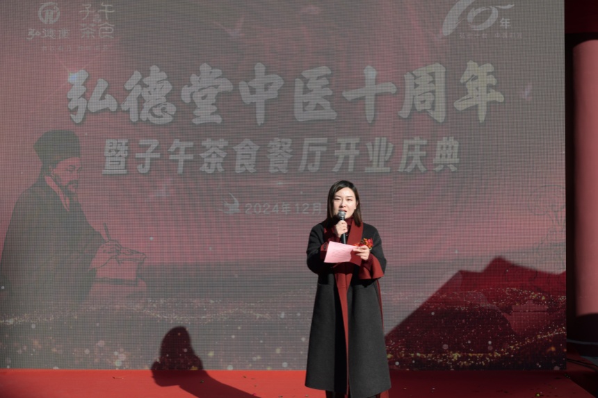 在答谢辞中,上海弘德堂健康管理有限公司总经理李瑞深情回顾了弘德堂十年来的发展历程。他表示,弘德堂中医创立至今,每一步都凝聚着团队成员的心血和汗水。中医药食同源是中华民族五千年文明的瑰宝,子午茶食餐厅是弘德堂的创新成果,致力于将传统中医养生智慧与现代餐饮文化相结合,为顾客提供既美味又健康的饮食体验。未来,弘德堂将继续坚守初心,传承创新,为人们提供更加优质、便捷的中医药服务。同时,子午茶食餐厅也将成为弘德堂的新名片,吸引更多市民前来品尝美食、感受中医药文化的独特魅力。