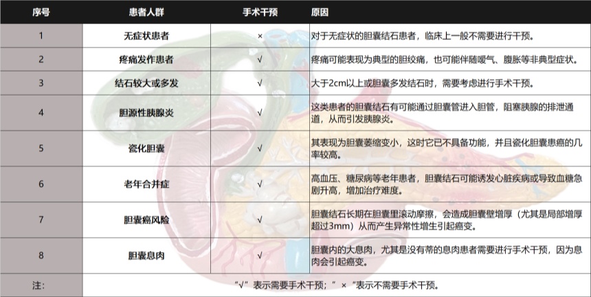 从图1中可以看出,除了无症状患者不需要手术干预之外,其他包括由胆囊结石引起反复疼痛的患者、胆囊结石较大或多发的患者、胆源性胰腺炎患者、瓷化胆囊患者、老年合并症患者、胆囊癌风险患者、胆囊息肉患者等均建议手术干预。