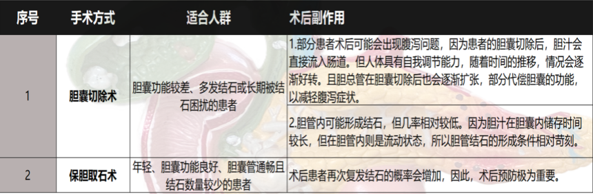 (1)胆囊切除术适合胆囊功能较差、多发结石或长期被结石困扰的患者,但部分患者术后可能会出现腹泻和胆管内形成结石的副作用。腹泻的患者主要是因为胆囊切除后,原先在胆囊内存储的胆汁直接流入了肠道,但人体具有自我调节功能,随着时间推移情况会逐渐好转,且胆总管在胆囊切除后也会逐渐扩张,部分会代偿胆囊功能,以减轻腹泻症状。而胆管内可能会形成结石的概率则相对较低,因为胆汁在胆管内是流动状态。