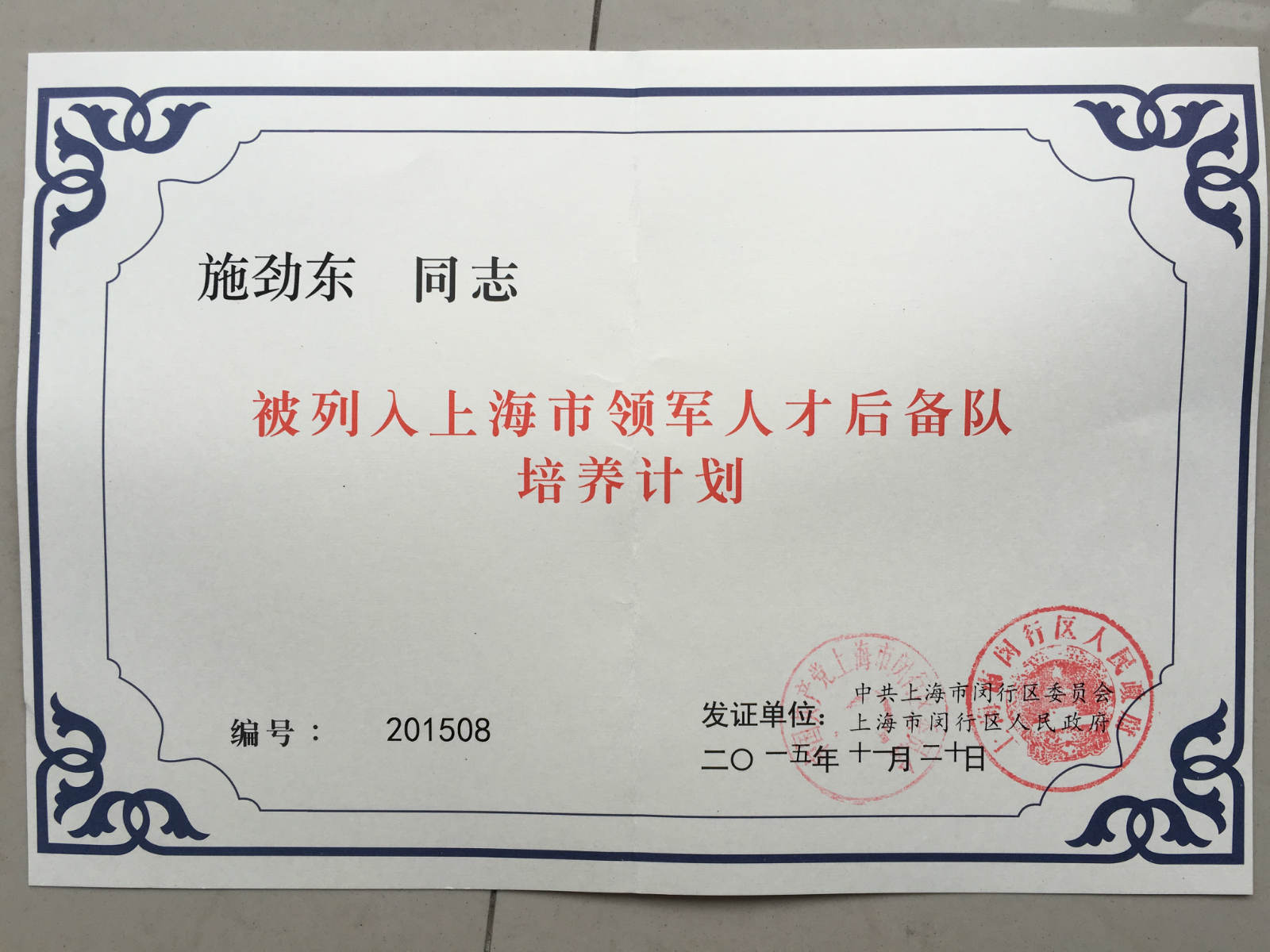 施劲东副主任医师荣获“2015-闵行区领军人才”证书
