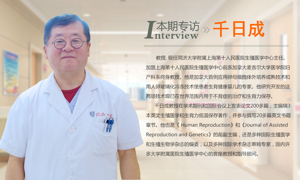 教授,现任同济大学附属上海第十人民医院生殖医学中心主任。加盟上海第十人民医院生殖医学中心前系加拿大麦吉尔大学医学院妇产科系终身教授。他是加拿大首例应用卵母细胞体外培养成熟技术和用人卵玻璃化冷冻技术使患者生育健康婴儿的专家。他研究开发的这两项技术现已在世界范围内用于不育症的治疗和生育力保存,已使成千上万个健康婴儿出生。千日成教授在学术期刊和国际会议上发表论?200多篇,主编辑3本英文生殖医学和生育力低温保存著作,并参与撰写20多篇英文书籍章节。他也是《Human Reproduction》和《Journal of Assisted Reproduction and Genetics》的前副主编,还是多种国际生殖医学和生殖生物学杂志的编委,以及多种国际学术杂志审稿专家,国内许多?学附属医院?殖医学中心的客座教授和指导顾问。