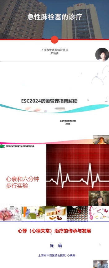 9月26日和9月30日分别为线上专题讲座。9月26日,上海市中西医结合医院心内科朱怡菁主治医师分享了“肺栓塞的诊治”; 上海市中西医结合医院心内科吴晓蓉主治医师分享了“ESC2024年房颤管理指南解读”; 上海市中西医结合医院心内科傅英杰主治医师分享了“心衰与六分钟步行试验”; 上海市中西医结合医院心内科庞瑜主治医师则分享了“心悸治疗的传承与发展”。