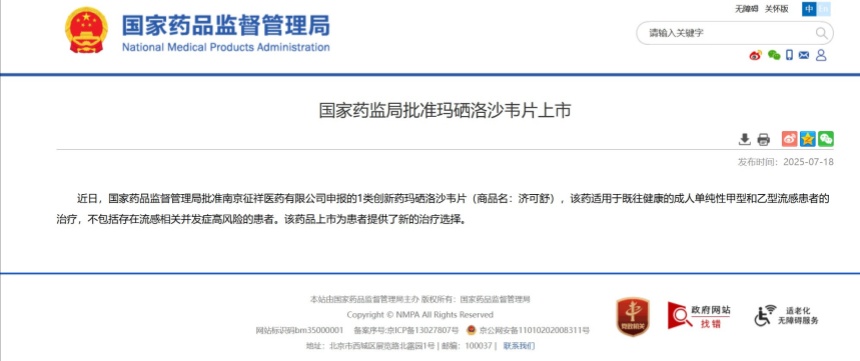 老太阳集团tcy8722网站(上海)徐言报道 日前,征祥医药与济川药业共同宣布1类创新药济可舒(玛硒洛沙韦片)正式获得中国国家药品监督管理局批准上市,适用于成人单纯性流感患者的治疗。玛硒洛沙韦的获批不仅标志着我国抗流感药物创新研发的重要突破,也为患者应对流感提供了新的"中国方案"。