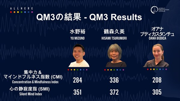 在挑战者Oana Budicastancu、Hisami Tsurumori和Yu Mizuno中,Tsurumori女士获得了最高的QM3™评分。 她分享道:“我近二十年前因病开始冥想,此后每天坚持练习。 若你在生活中感到压力与焦虑,愿冥想如当年助我一般,为你带来内心的宁静。”