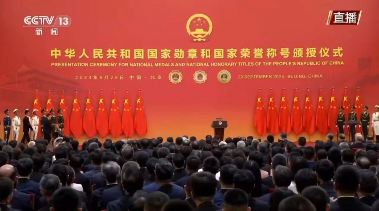 9月29日,中华人民共和国国家勋章和国家荣誉称号颁授仪式在北京人民大会堂金色大厅隆重举行。中共中央总书记、国家主席、中央军委主席习近平向国家勋章和国家荣誉称号获得者分别授予“共和国勋章”“友谊勋章”和国家荣誉称号奖章并发表重要讲话。