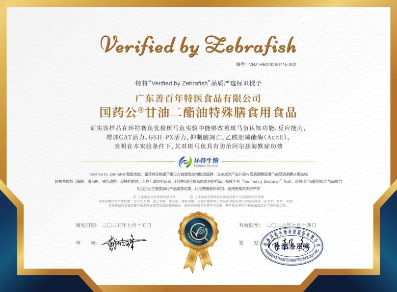 目前一项由全球领先的斑马鱼技术研究机构——环特生物进行的实验表明:由广东善百年特医食品有限公司提供的国药公®甘油二酯油特殊膳食用食品,在实验中,改善反应能力提升95%,改善认知能力提升102%,抑制脑凋亡效果提升94%,增加CAT活力效果提升88%,增加GSH-PX活力效果提升了38%,抑制AchE活性效果提升66%。具有防治阿尔兹海默症功效。